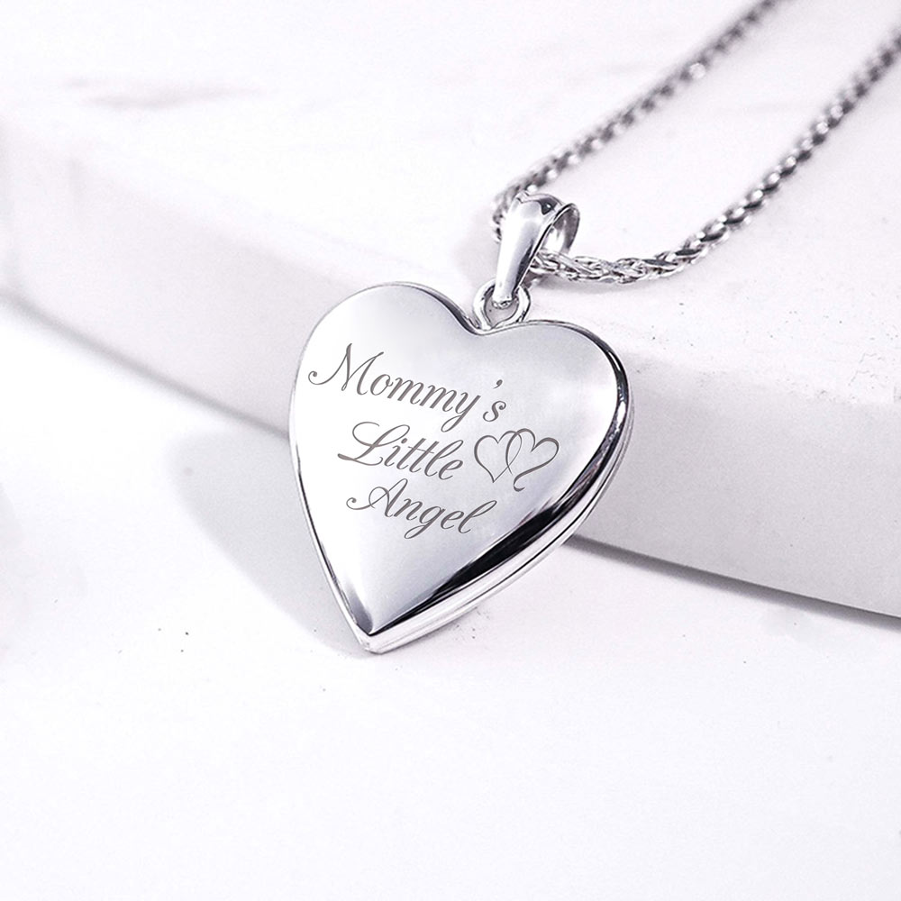 This Heart Locket is .925 Solid Sterling Silver and holds 2 photos. The front of this locket is engraved with Mommys Little Angel. This beautiful locket can be engrave with a personal message on the inside and reverse side. This is the perfect gift for any occasion.