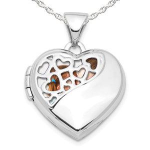 The front side of this locket has a design that allows for visibility into the interior, making it a unique look that shows the photo or engraving inside.