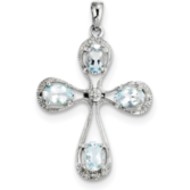 Sterling Silver Rhodium Aqua & Diamond Cross Pendant