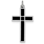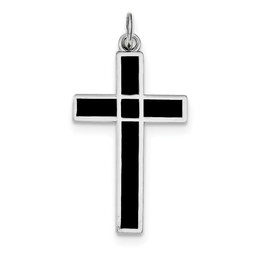 Sterling Silver Rhodium-plated Brshed & Polished Enml Black Cross Pendant