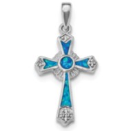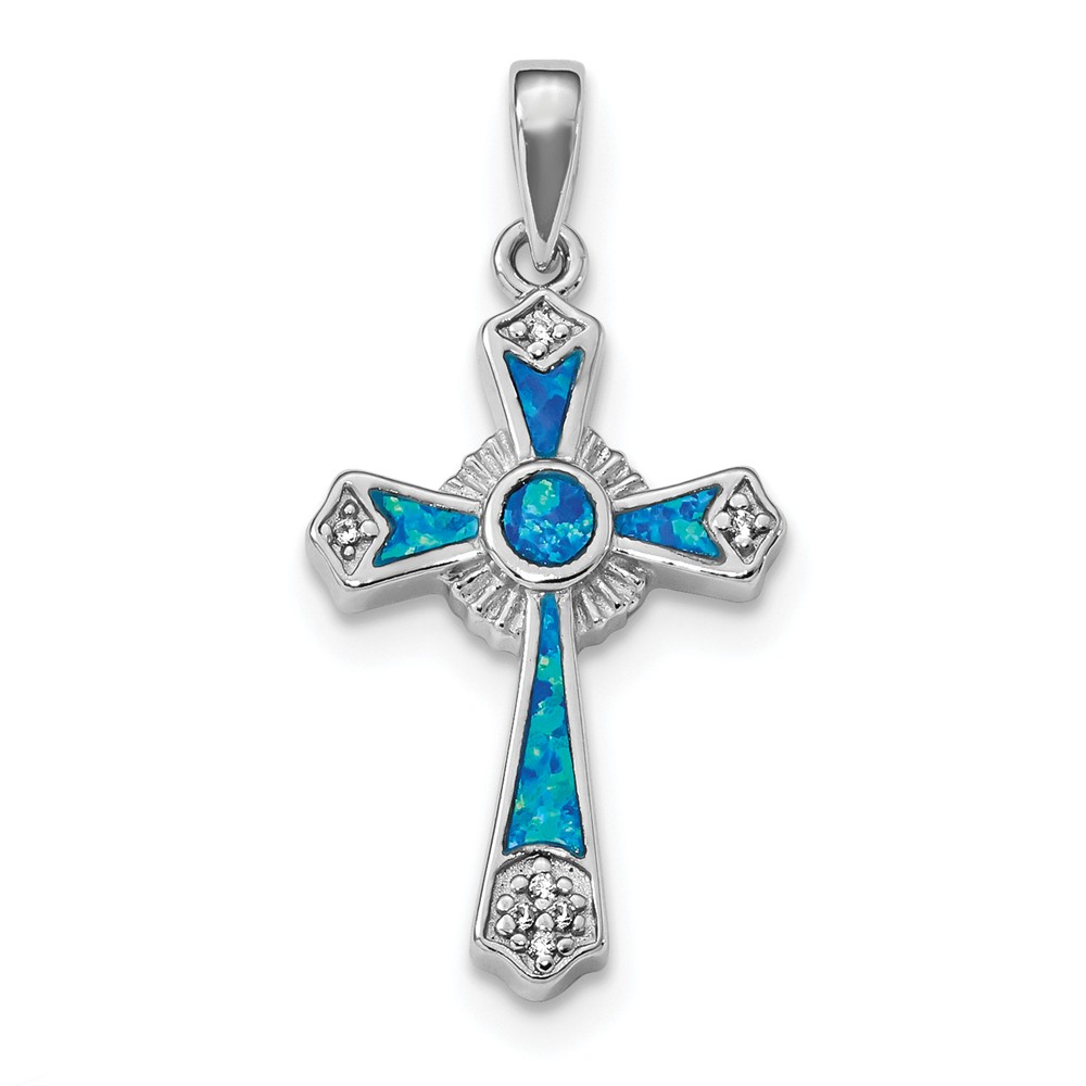 Sterling Silver Rhodium-plated CZ & Created Opal Cross Pendant