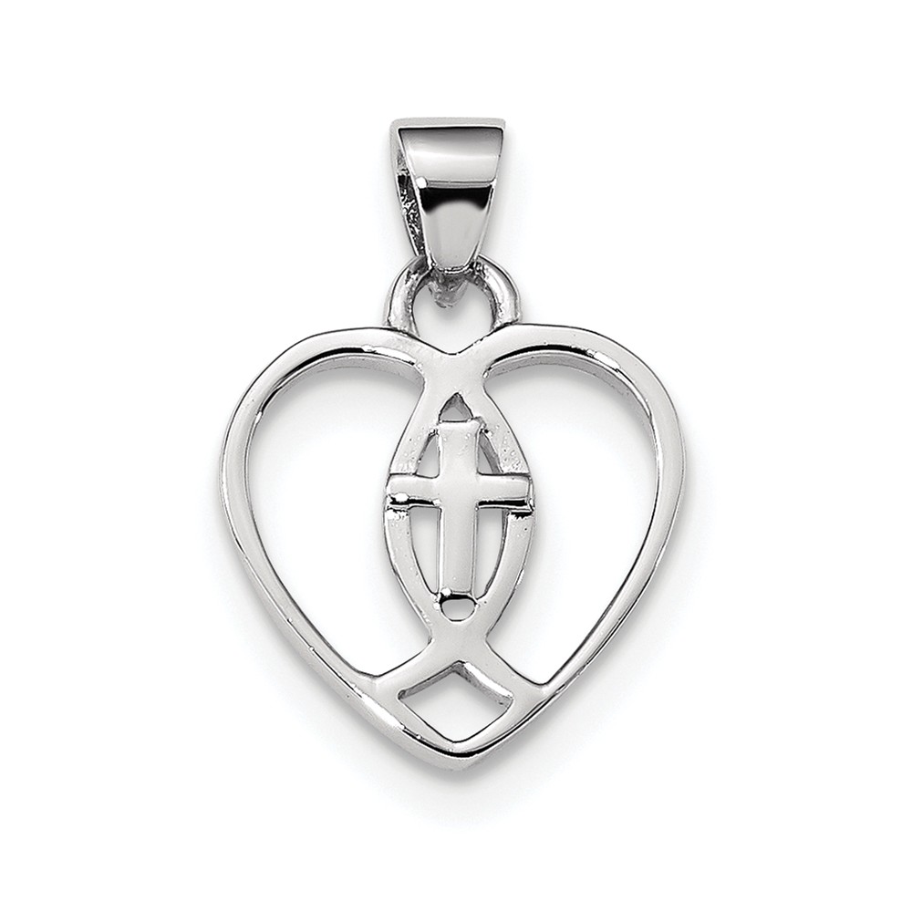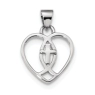 Sterling Silver Rhodium-plated Heart w/Ichthus and Cross Pendant