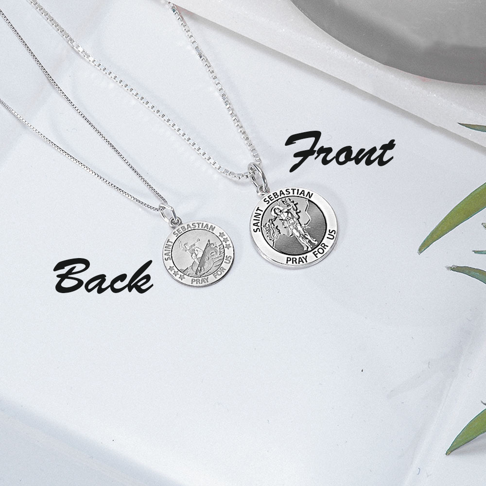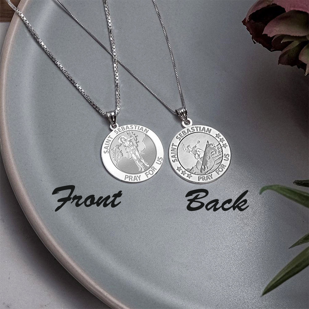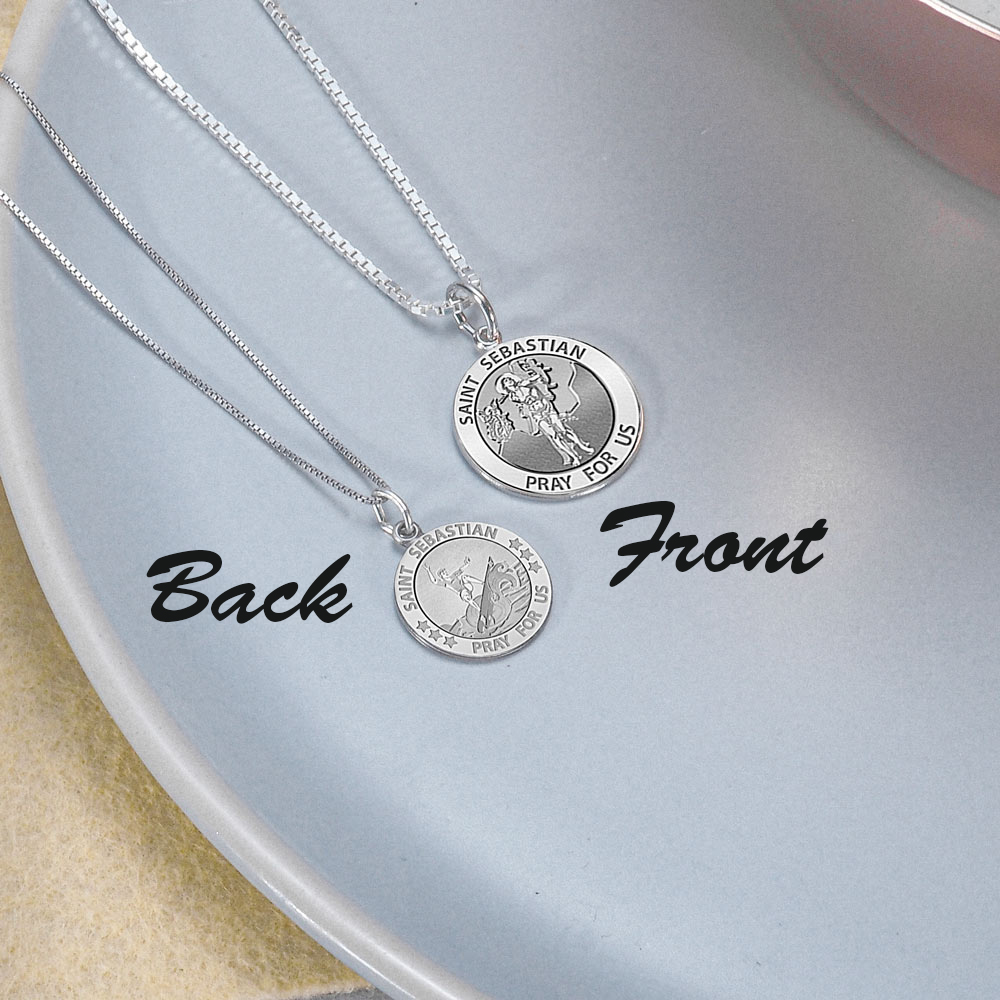 Saint Sebastian was a Christian saint and martyr, who is said to have been killed while the Roman emperor Diocletian engaged in the persecution of Christians in the 3rd century. He is commonly depicted in art and literature tied to a post and shot with arrows just like on this medal. He is patron saint to Soldiers, plagues, arrows, athletes and unofficially youth.