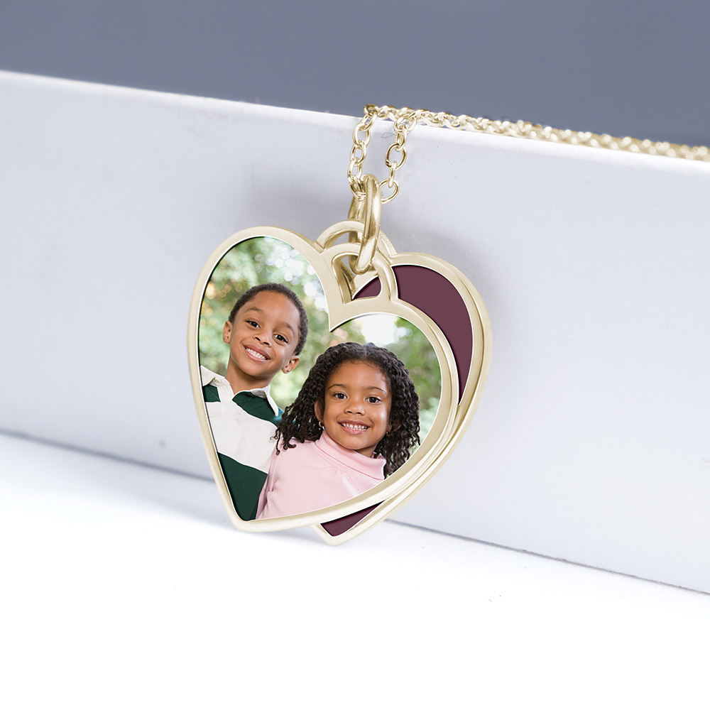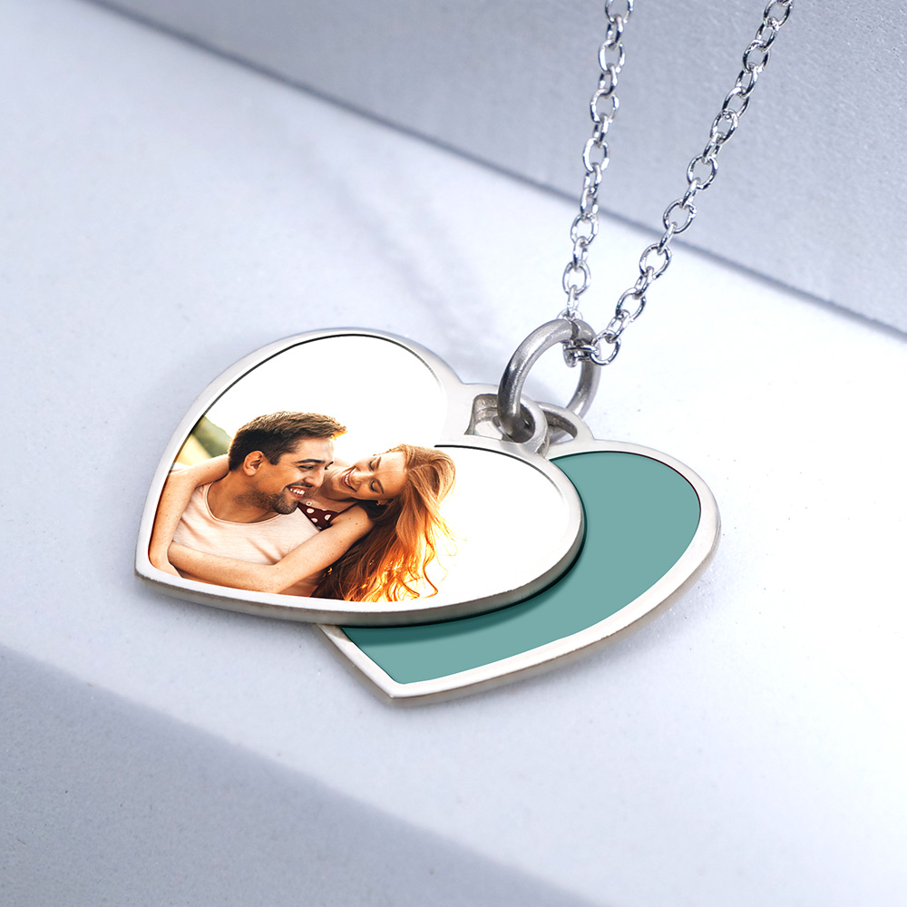 These new swivel pendants are two pendants in one. The outside portion can be engraved with a monogram or message and the interior slides over to reveal your photograph. Heart Measures 1 Inch x 1 Inch which is about the size of a US quarter.