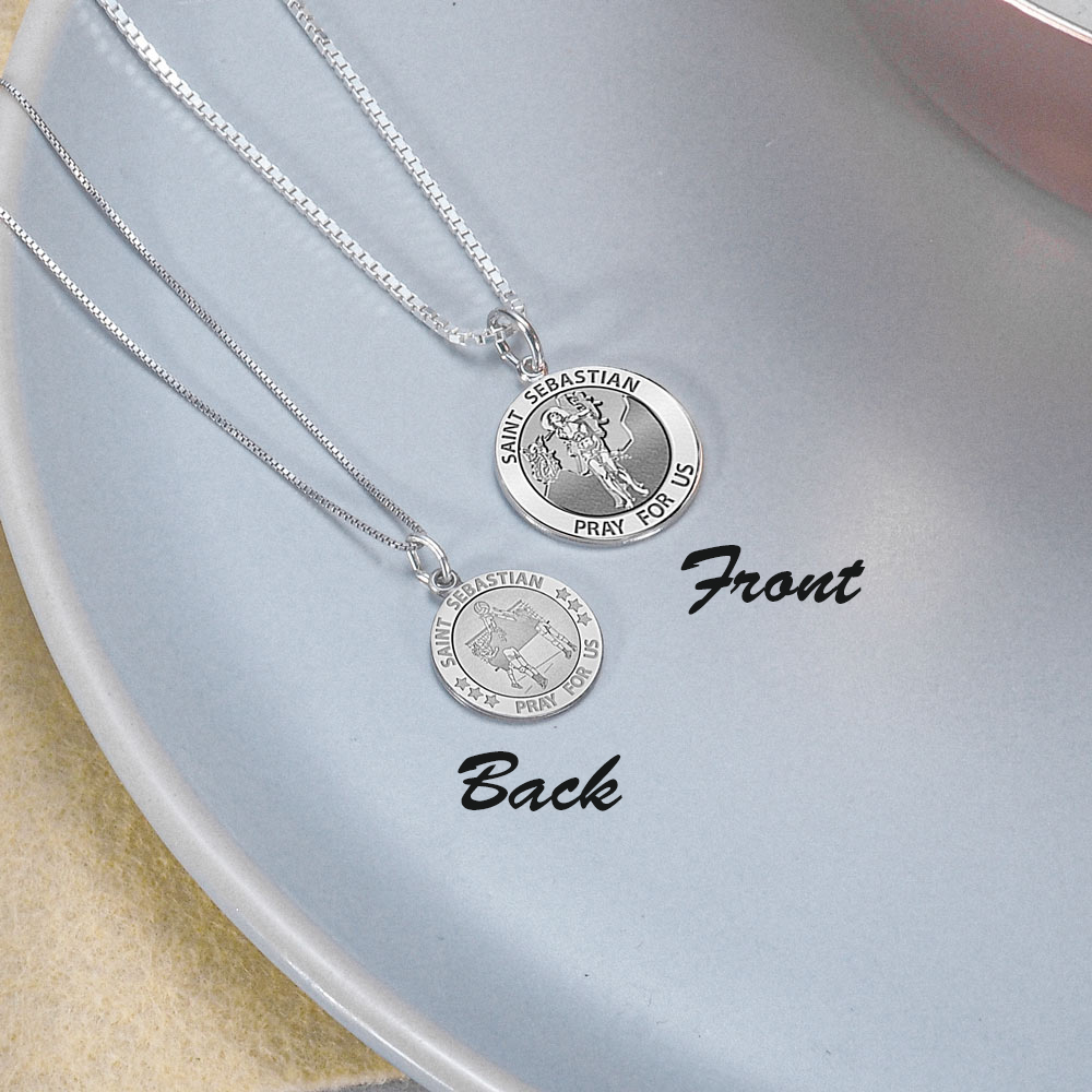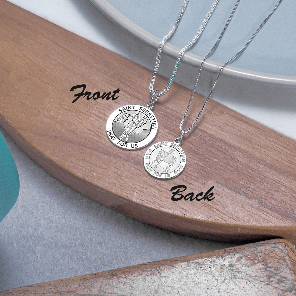 Saint Sebastian was a Christian saint and martyr, who is said to have been killed while the Roman emperor Diocletian engaged in the persecution of Christians in the 3rd century. He is commonly depicted in art and literature tied to a post and shot with arrows just like on this medal. He is patron saint to Soldiers, plagues, arrows, athletes and unofficially youth.