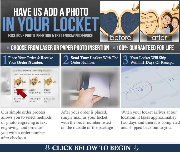 First you need to place an order for your locket to be photo engraved right here online. When youre ready just start the ordering process above by selecting if you will be mailing us a gold locket or a silver locket. You will be walked through an easy ordering process. During the process you will be asked which method you will use for sending us your photos for your locket, Photos can be sent via e-mail, uploadedormailed in with the locket.